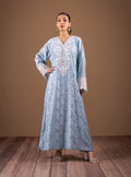 Step into a world of timeless elegance with this ice blue kaftan with Self-Print and hand embroidery. The neckline and sleeves are exquisite hand embroideries, meticulously crafted with precision and care. Each intricate motif tells a story of artisanal craftsmanship, adding a touch of opulence and refinement to the kaftan.