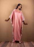 Embellished with subtle yet intricate detailing this silk kaftan in a tea pink color adds an extra touch of allure elevating its beauty to new heights.