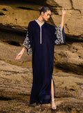An opulent floor length royal blue kaftan with a flattering V neck and a short slit on the side, exudes glamour. Complemented with intricate hand embroidered embellishments that adorn the sleeves.