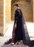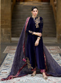 An ensemble that makes you feel like royalty, draped in magnificent beauty. Crafted from the most exquisite Deep Navy Blue Velvet, this piece offers a silhouette of sophisticated grace, with a luxurious weight that feels truly special. The magic unfolds in the breathtaking hand-embellished details: intricate gold dabka and delicate stones cascade across the neckline, sleeves, and side panels, sparkling with an artisanal brilliance that speaks of heirloom quality. Paired with luxurious jamawar trousers in a rich fuchsia-gold print, and a sheer mesuri dupatta with jamawar borders