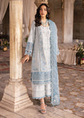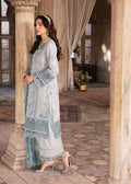 AMBER serenity, softened in ice blue. A tranquil design that speaks in hushed tones, with embroidered front panels and sleeves that melt into a fluid rawsilk canvas. Paired with a delicate dupatta, it moves with grace a whisper of elegance made to be worn where ease and refinement coexist in perfect harmony.