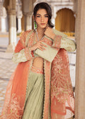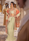 SABAZKARIYA a fresh whisper of nature in sage green. Intricately embroidered rawsilk forms the foundation of this ensemble, where quiet craftsmanship meets elevated design. The soft fall of the dupatta adds fluid movement, creating a look that breathes grace into every step serene, earthy, and effortlessly refined.
