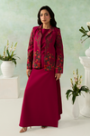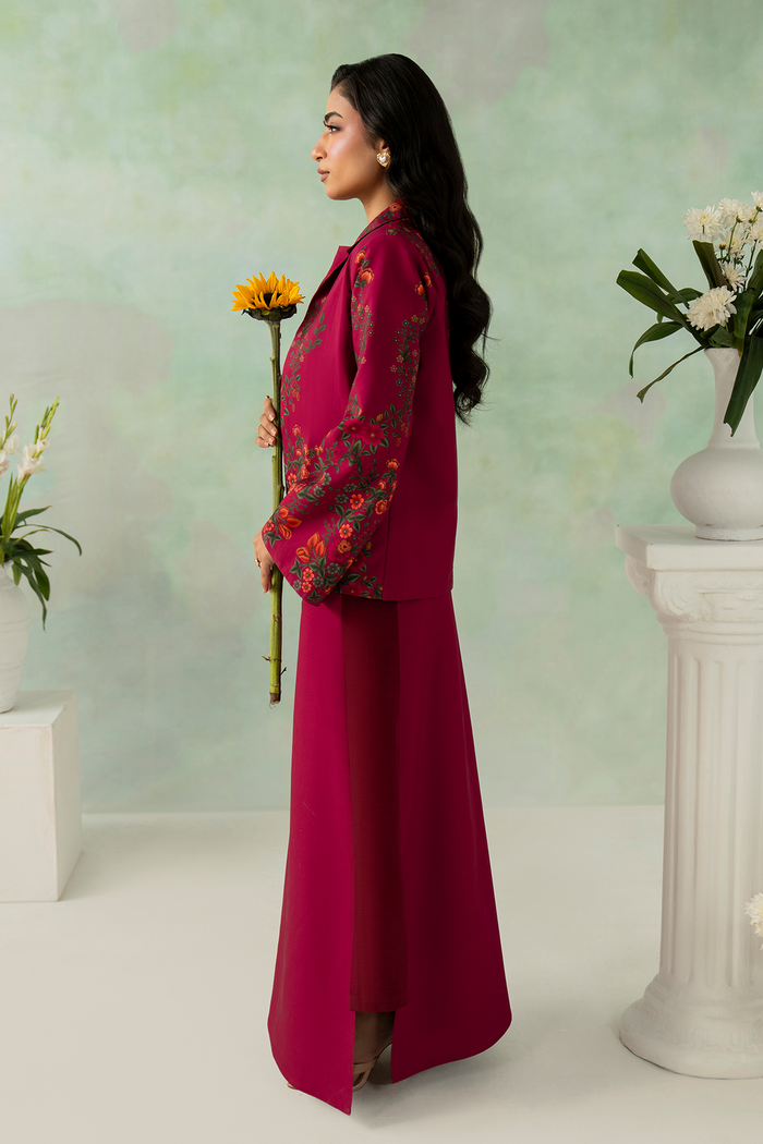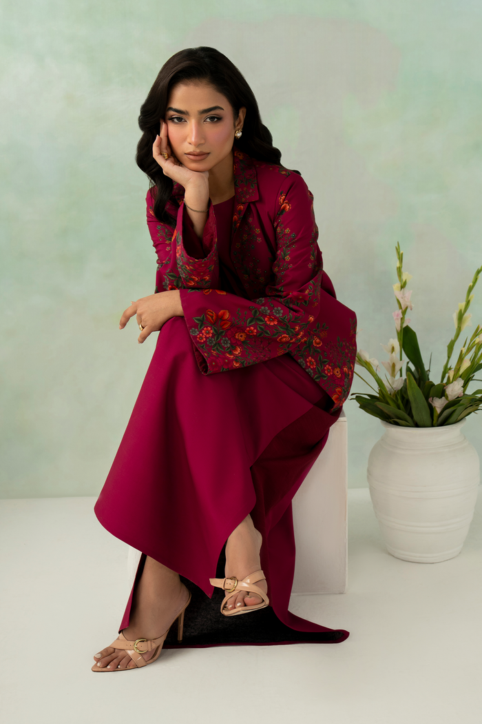 A sophisticated rosewood ensemble with a smooth texture and graceful drape. The rich, muted hue enhances the refined silhouette, creating a look that is timeless, elegant, and effortlessly polished.