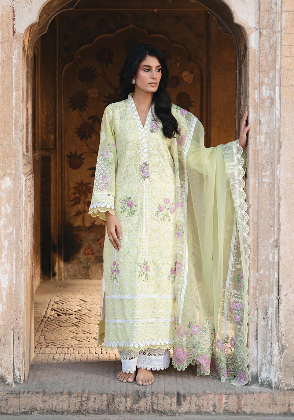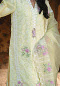 Within the quiet shelter of arches, Gulnaar-e-Baagh unfolds with softened grace. Pistachio chikankari forms the disciplined base, while floral accents emerge like blossoms against spring air deliberate yet expressive. Lace-trimmed borders introduce delicacy, allowing texture to breathe.