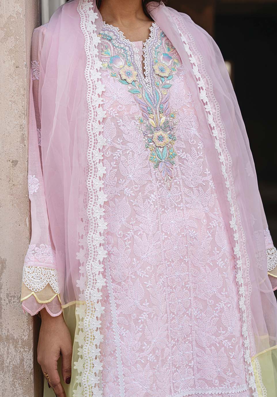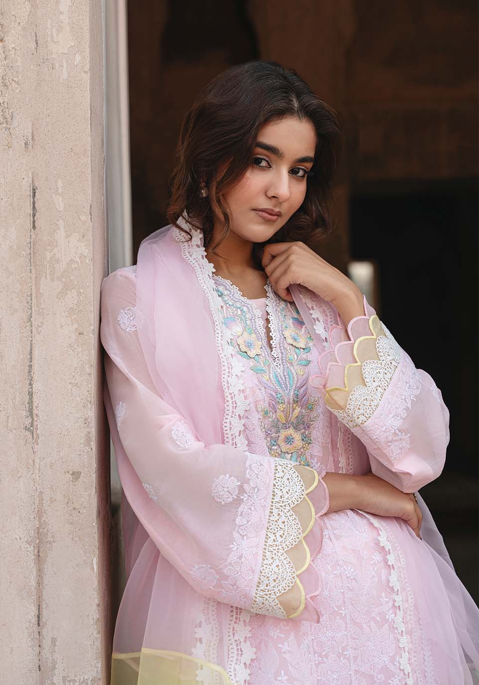 Beneath the quiet curve of carved arches, Gulrukh unfolds in softened radiance. Blush chikankari articulated with delicate tonal embroidery creates a surface of quiet intricacy, while pastel accents at the neckline introduce cultivated color without excess. The composition remains balanced, allowing detail to gather gently rather than command attention.