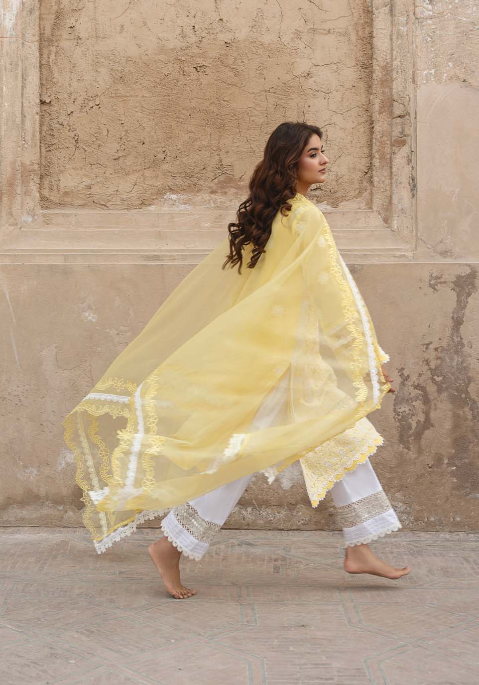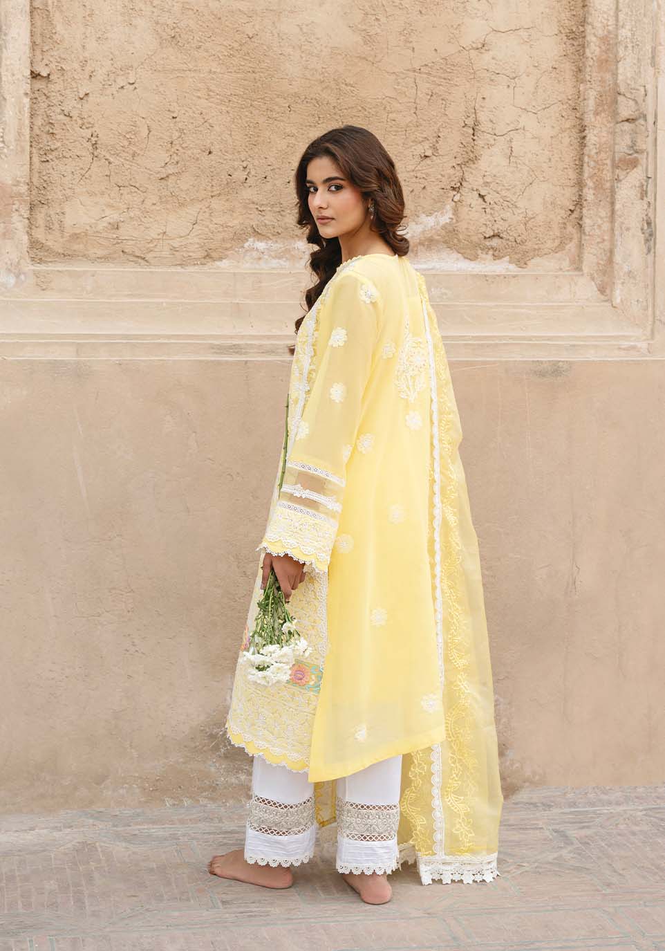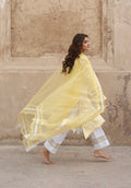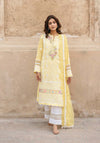 At first light, when gold meets marble in composed silence, Mehr Afroz asserts its presence through disciplined luminosity. Lemon chikankari articulated with ghara embroidery reveals depth within clarity, each stitch measured, each border resolved by hand. The silhouette remains structured yet fluid, allowing brilliance to gather without excess. This is cultivated radiance heritage refined, light governed by craft. Mehr Afroz stands as a testament to luminosity shaped by lineage.
