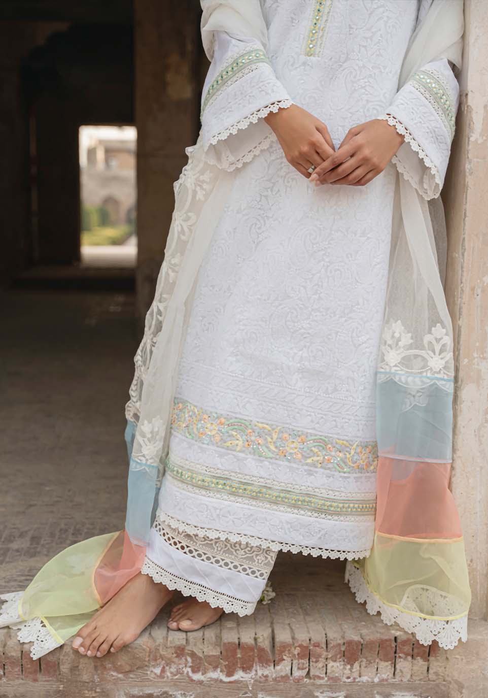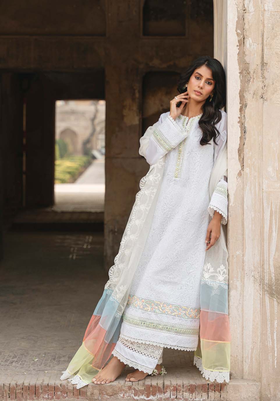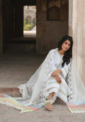 In the stillness beneath vaulted arches, Noor-un-Nisa gathers light with composed grace. Ivory chikankari forms a disciplined canvas, upon which multi-coloured mirror work and delicate embroidery emerge in measured harmony. Each reflective element is placed with intention, allowing radiance to bloom without overwhelming the surface.