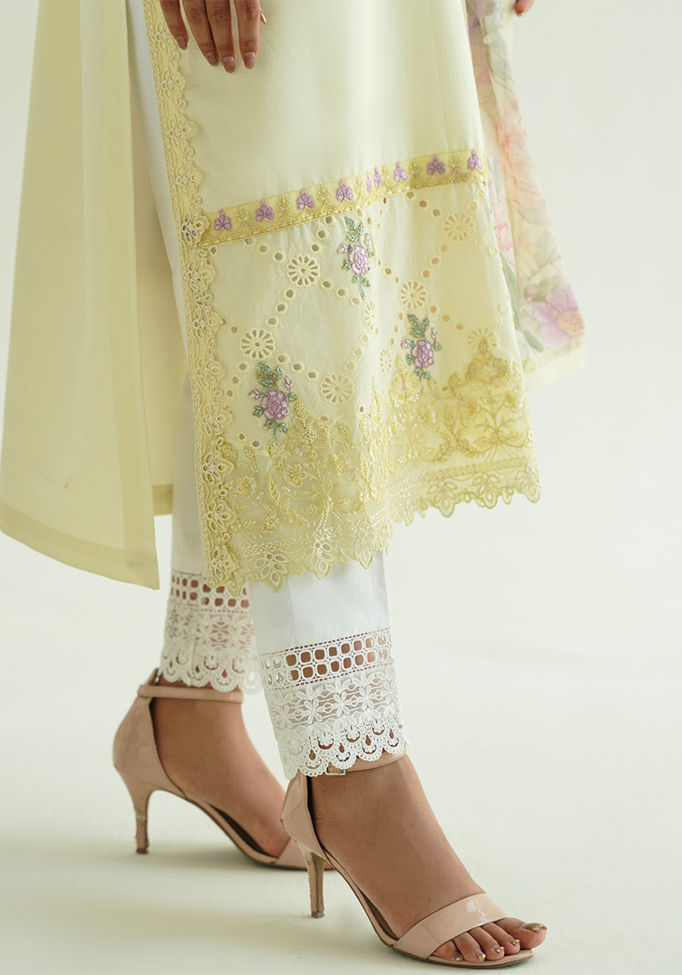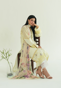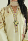 A soft serenade in butter yellow, this self-textured lawn kurta is gracefully intertwined with delicate eyelet fabric. The front is adorned with intricately embroidered rosettes in romantic hues of lavender, lilac, and sage lending a painterly charm to the piece. The silhouette is further elevated with tonal embroidery on the hem and cuffs, creating a harmonious blend of texture and detail. Paired with a dreamy digital-printed dupatta in soft florals and our signature ivory pants featuring intricate lace detailing, this look exudes timeless elegance with a fresh summer spirit. contrary to reality or truth with the intent to deceive