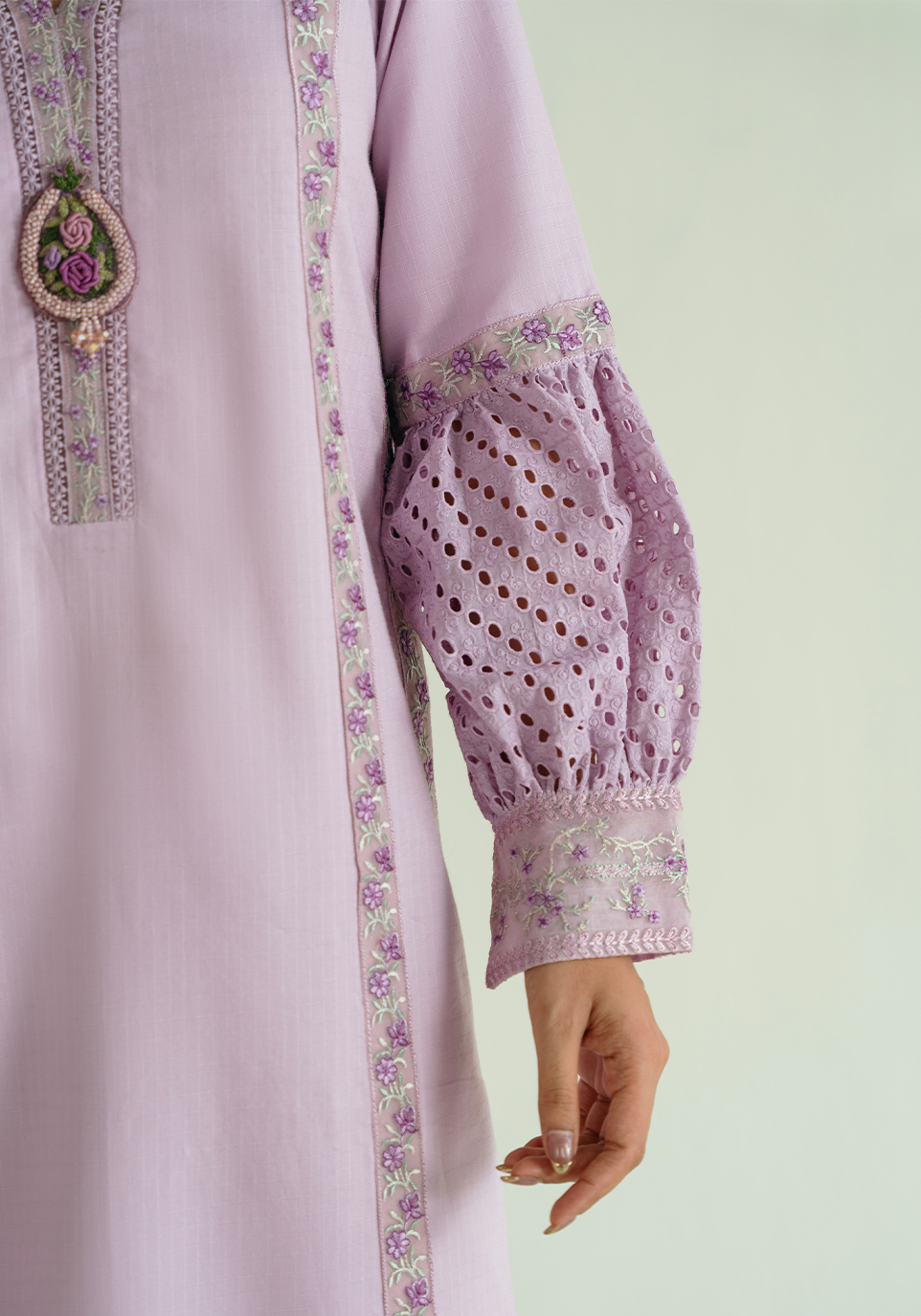 Lavender Vines, a soft lilac tunic designed for effortless summer elegance. Delicately embroidered vine motifs cascade along the neckline and panels, highlighting the beauty of intricate handwork and artisanal detailing.