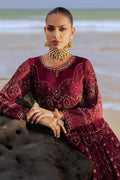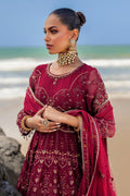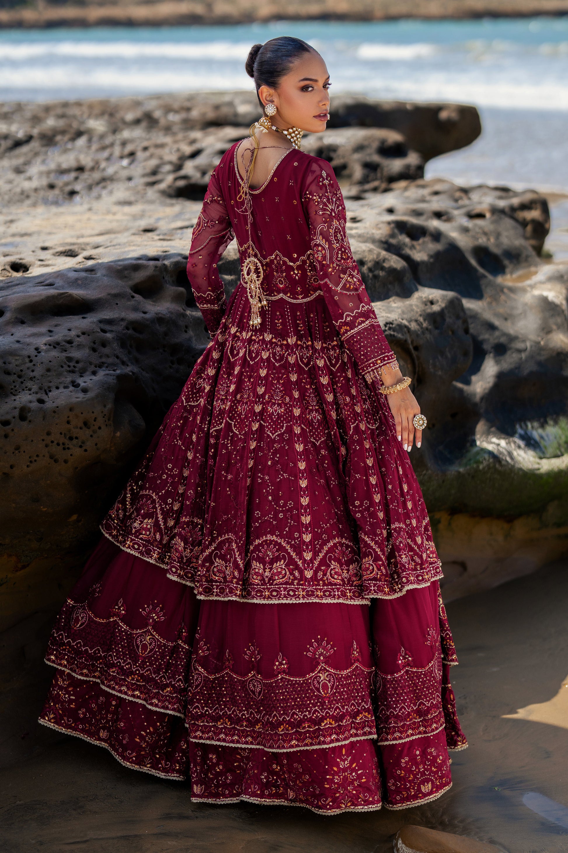 Zurial is the ultimate royalty on burgundy red canvas. This layered frock is maliciously adorned with round neckline & composed bodice. The bodice & sleeves are adorned with hand adda embellishments, embroidery & sequin work along with handmade hangings. The back is adorned with heavy handmade tassels. The first layer of the frock is heavily adorned with embroidery & sequin work with Mughal inspired dome & floral motifs with contrasting touch of orange along with exquisite patterns, finished with embroidered border & minimal lace. The second layer is bejeweled with heavy pattern work with embroidery & sequin, along with Mughal inspired motifs, borders & minimal lace. The final layer is adorned with a lavish embroidered border with sequin work, texture play & minimal lace. The dupatta is adorned with motif spread in the mid & heavy composed motifs on pallu sides, finished with minimal border with the hues of red & orange embroidery details & minimal lace.